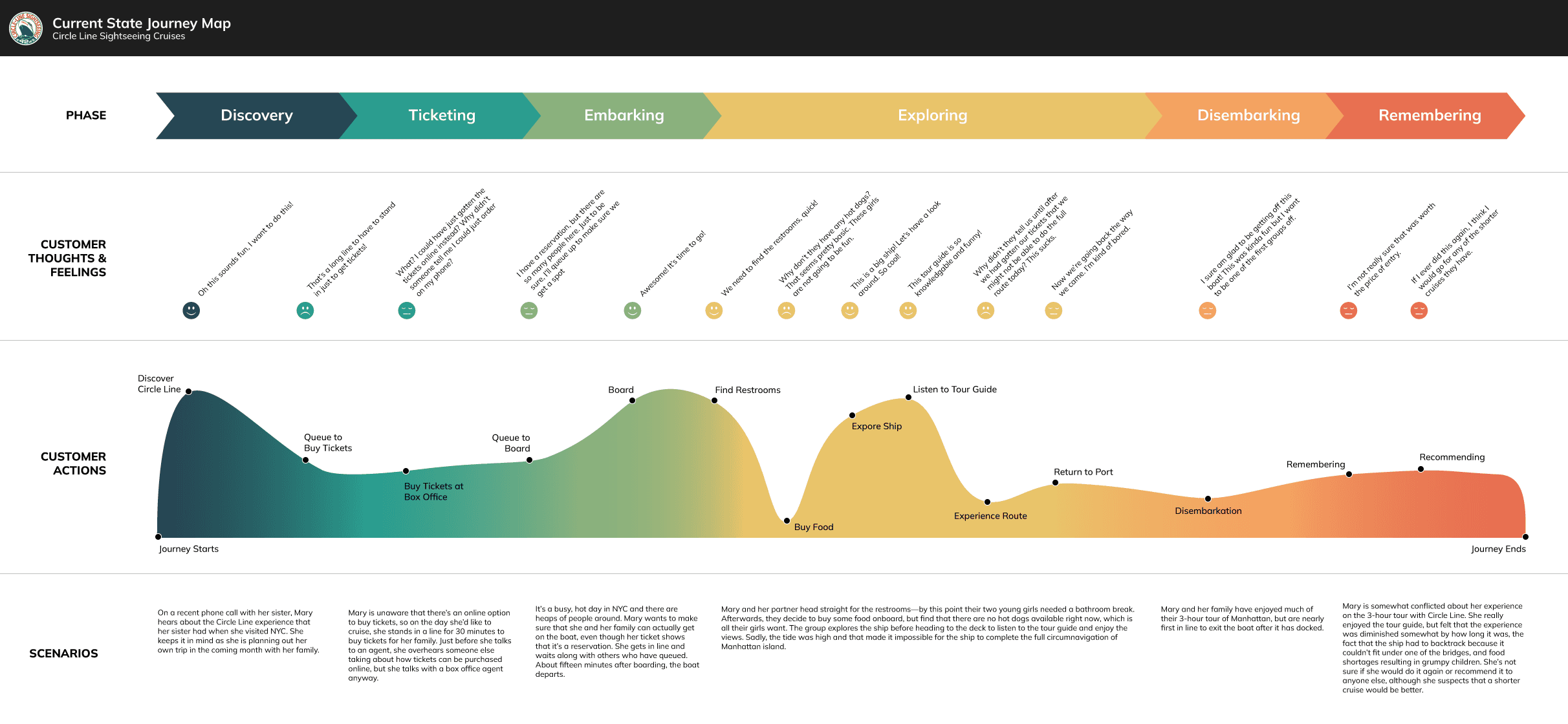 It was important to get a baseline for what the customer experience was like, from the discovery of Circle Line all the way through to post-cruise reflections. Business stakeholders again were deeply helpful in helping me understand the numerous avenues that customers take along this journey. Some customers book their tickets online, for a specific time and day. Others buy vouchers online to allow for flexibility. Many customers received vouchers as part of a larger travel package that they purchased. Some users decide to take cruises simply by walking past Circle Line's dock at Pier 83 and standing in line to buy a ticket for the next boat leaving. As a digital native, I was surprised by the myriad ways in which customers engage with Circle Line, often without using digital devices to book tickets. I created a current-state journey map with the information that I had and later updated it after I had completed my evaluation.