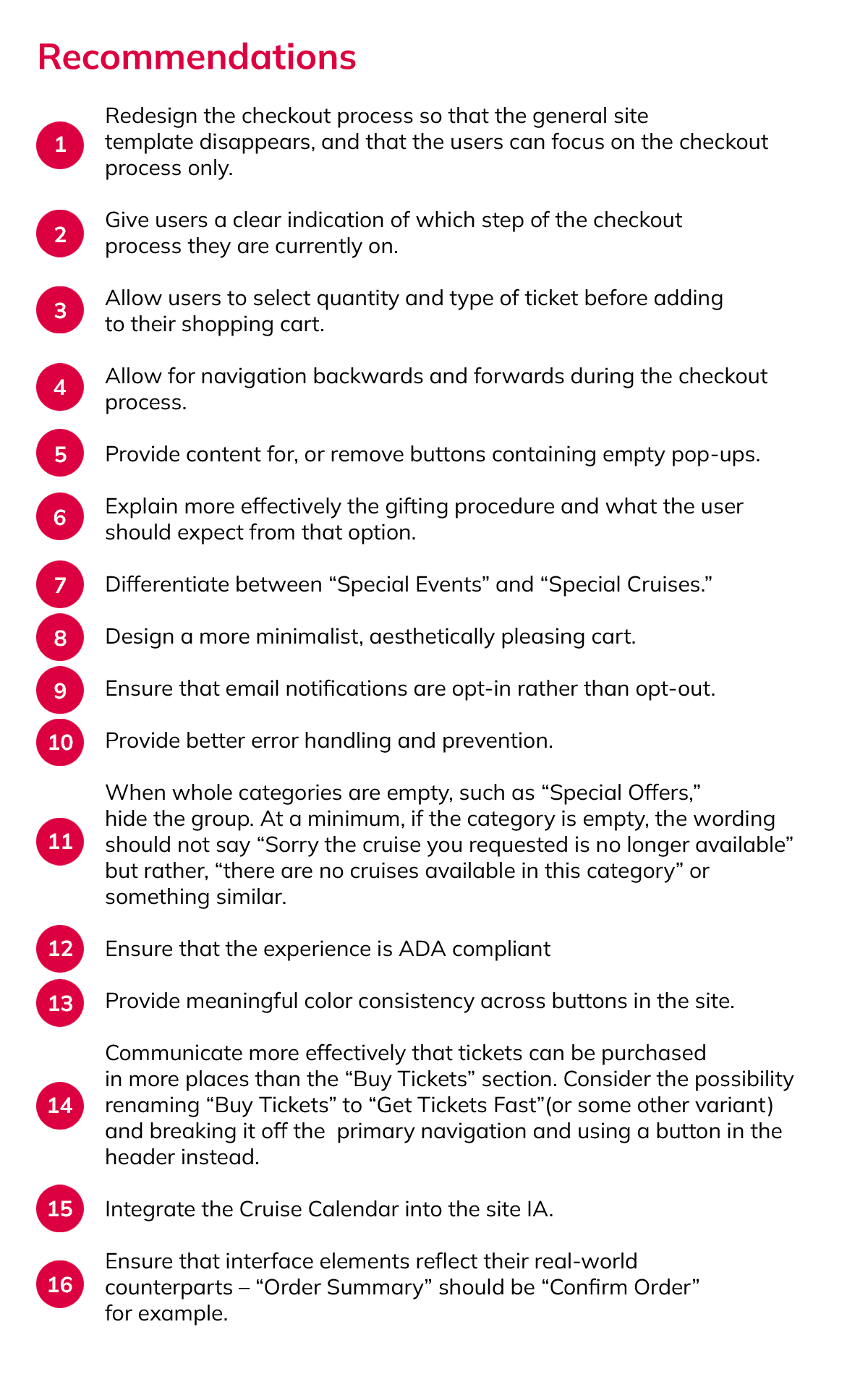 To thoroughly assess the issues, I conducted an expert heuristic review of the ticketing and checkout experience. This exercise yielded 16 recommendations, ranging from aesthetics to usability and accessibility concerns. The key takeaway was clear: Circle Line needed to overhaul their online presence from the ground up.