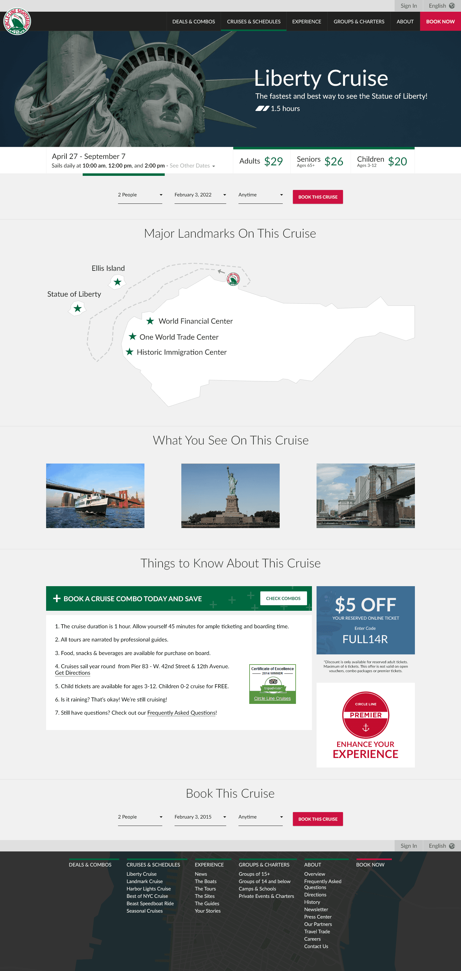 As a Senior Designer, I spearheaded a customer experience design initiative aimed at increasing ticket sales for Circle Line Sightseeing, a renowned boat-based sightseeing and entertainment company in Manhattan, New York. My contributions were part of a larger project which also included an internal process and technology review, with high level goals of increasing the customer base by 1.5x yearly, doubling cap on board sales, boosting unique website visitors by 1.2x, and doubling the overall number of website transactions over a period of three years.