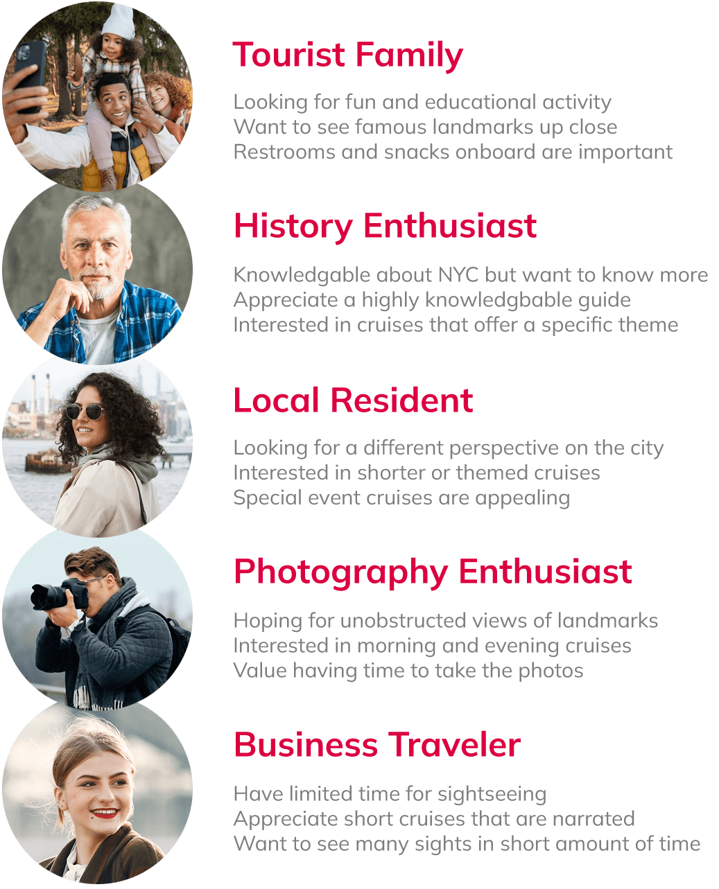 I began my research journey by interviewing business stakeholders to understand their perspective on customers. I was impressed by their deep knowledge and insights. Next, I gathered input from frontline employees, such as those managing ticket kiosks and assisting in the boarding or ticketing queue to gain their valuable perspectives. Following this, I conducted a dozen on-site customer interviews to gather data on demographics, goals, feelings, and behaviors. While I was considering how to organize the personas, I was struck by how diverse of a crowd that Circle Line attracted. People from all over the world in varying circumstances (e.g. limited knowledge of English, limited mobility) made accommodating everyone a genuine challenge.